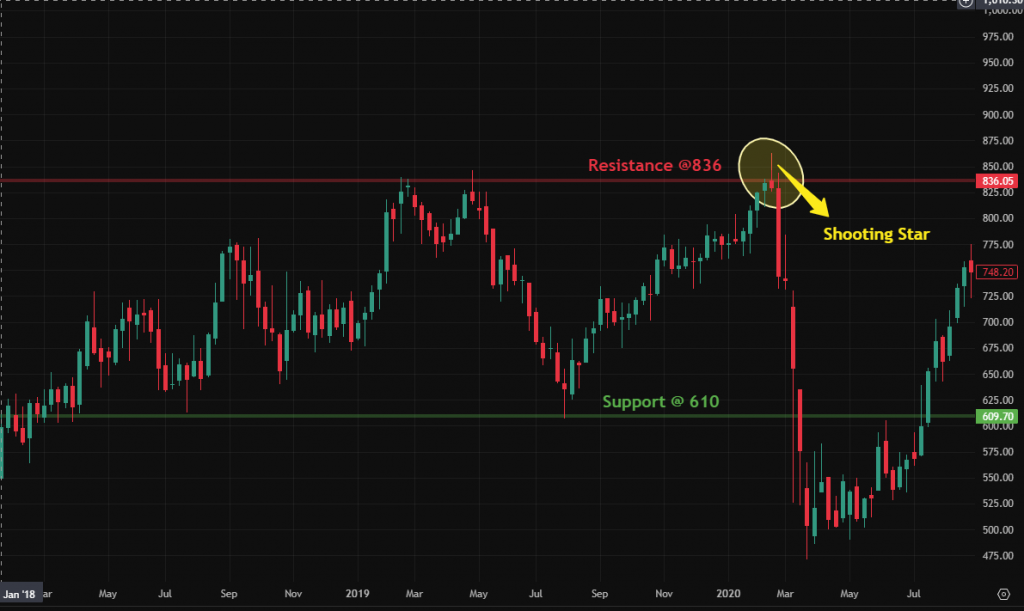 Now the price is moving back up toward ₹836. You wait for a signal of reversal (e.g., a shooting star) near ₹836 and if you see that signal, you may decide to short (sell) with your stop-loss just above the shooting star high (around ₹865) and then target the support of ₹610.
