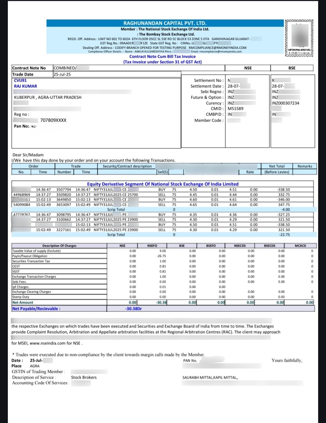 Once downloaded, your contract note will appear in the standard RMoney PDF format, containing complete details of your trades, charges, and settlement summary.