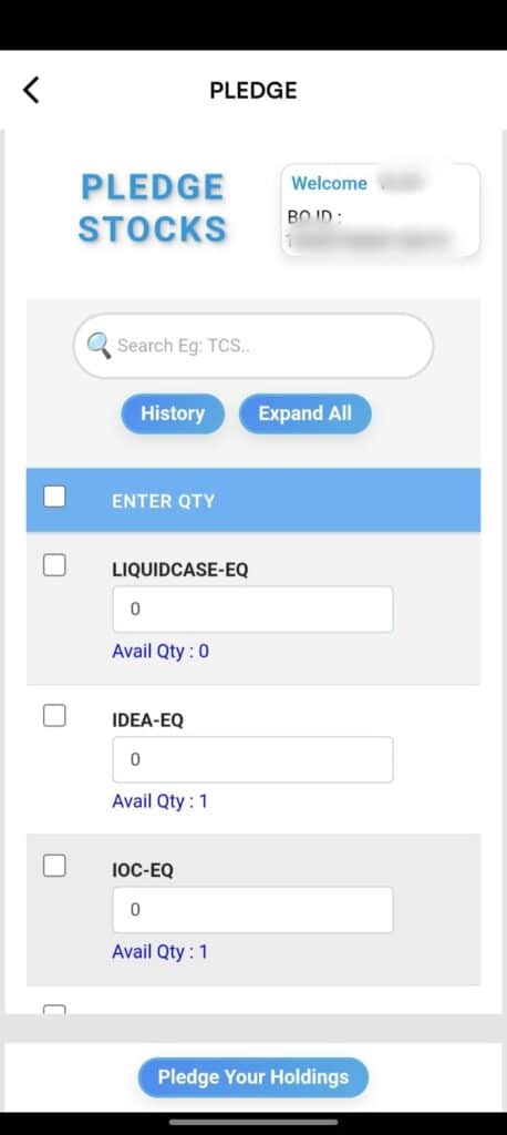 Pledging is the process of using your existing shares in your holdings as collateral to obtain trading margin.