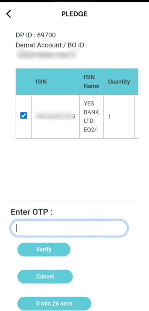 Enter the OTP and tap Verify to complete the pledge request.